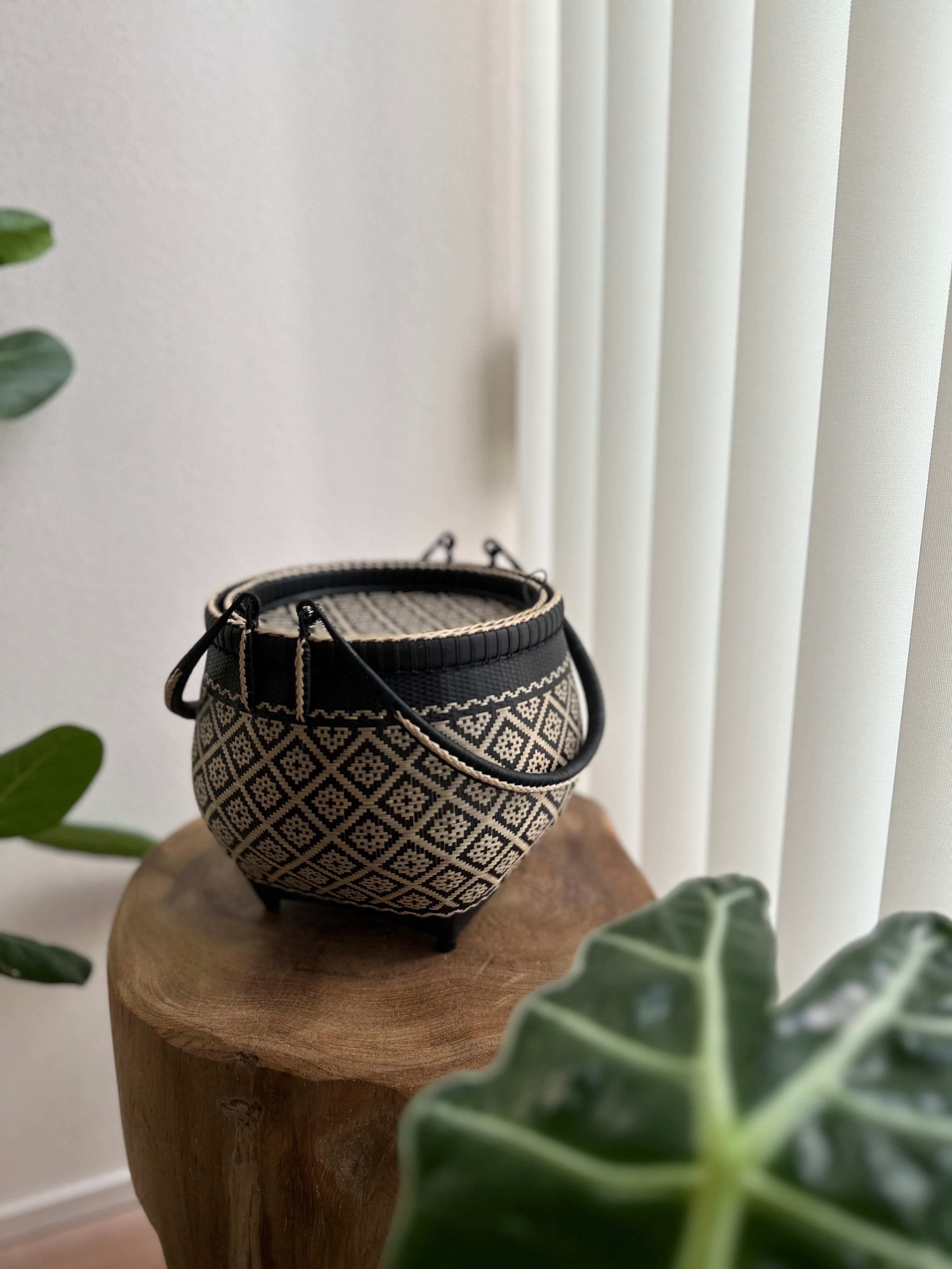 ブラックのキッドパターンがキリリとした印象を与えます。見た目とはうらはらに大容量。茶籠、花籠など用途は無限大。何気なく置くだけでも素敵なインテリアとしてご利用できます。